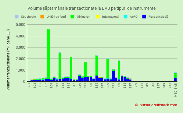 Volumul total al tuturor instrumentelor tranzacționate la BVB în această săptămână a fost de 278 milioane lei, valoare care se situează sub media săptămânală a anului, care este de 811 milioane lei.