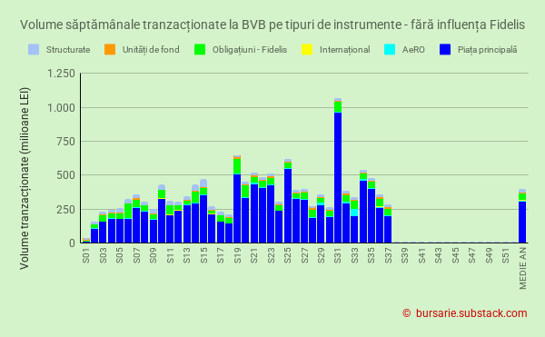 Pentru a face mai ușor de vizualizat graficul volumelor tranzacționate, prin excluderea din statistică a efectului înregistrării în sistemul de tranzacționare al obligațiunilor Fidelis, volumele săptămânale tranzacționate se prezintă astfel: