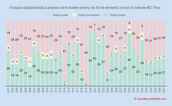 Graficul redă evoluția prețurilor de închidere în fiecare zi de vineri, comparativ cu prețurile de închidere din vinerea anterioară, pentru toți cei 50 de emitenți incluși în indicele BET Plus.
