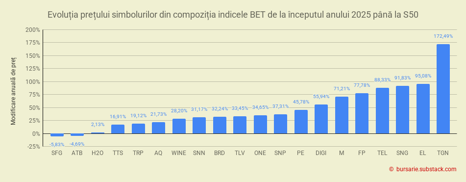 Topul creșterilor de preț din anul 2025 este ocupat de: SNG, EL și TGN.