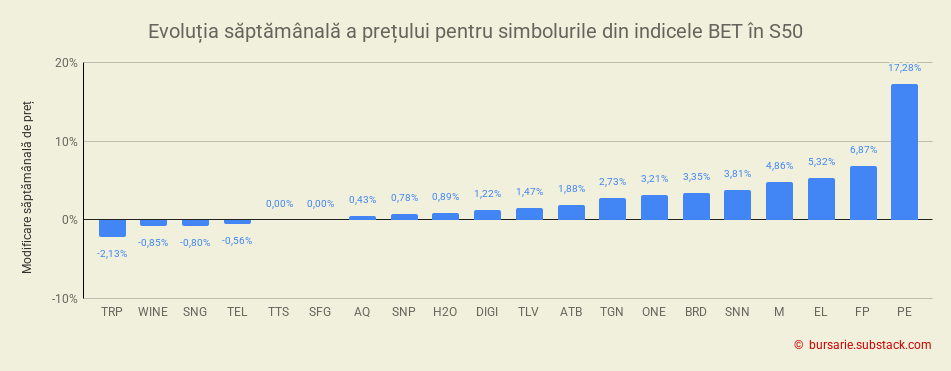 În săptămâna analizată plaja de fluctuații, în evoluția prețurilor simbolurilor din componența indicelui BET, s-a situat în intervalul de la -2% până la +17%.