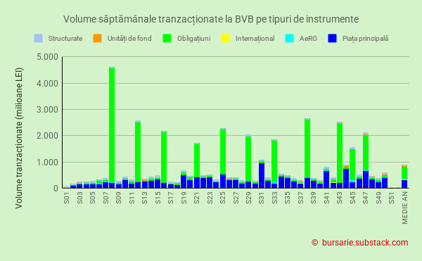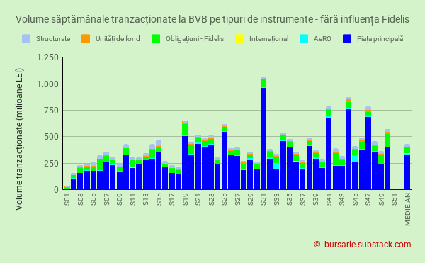 Pentru a face mai ușor de vizualizat graficul volumelor tranzacționate, am exclus din statistică efectul înregistrării în sistemul de tranzacționare al obligațiunilor Fidelis și BCR. În această situație, volumele săptămânale tranzacționate se prezintă astfel: