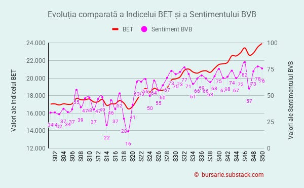 Această valoare plasează sentimentul pieței în zona de optimism. Valoric, sentimentul BVB scade ușor față de săptămâna anterioară de la 78 la 76 de puncte.