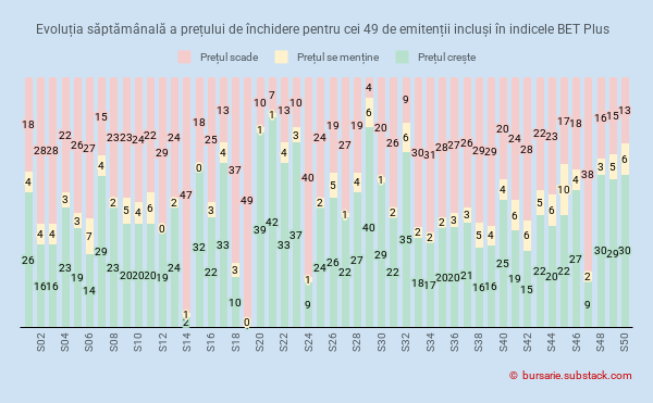 Pentru a ilustra sintetic pulsul pieței, am realizat o reprezentare grafică ce oferă o perspectivă de ansamblu asupra evoluției săptămânale a cotațiilor. Este un instrument vizual menit să transmită „dintr-o privire” starea generală a bursei.